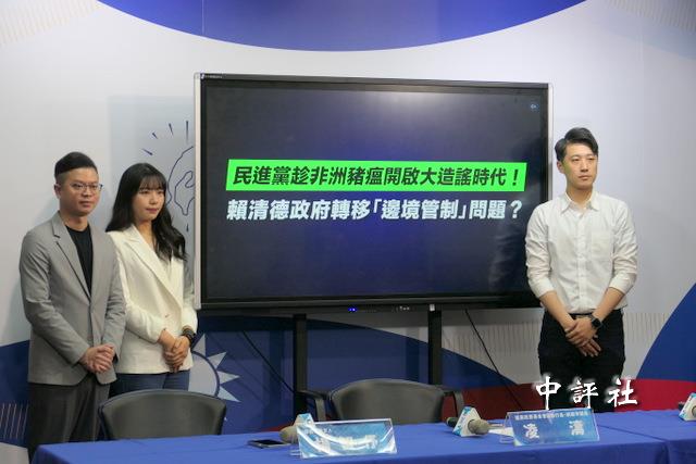 國民黨今日召開“民進黨趁非洲豬瘟開啟大造謠時代!“賴政府轉移‘邊境管制’問題?”記者會,包括智庫副執行長、桃園市議員凌濤和發言人楊智伃、鄧凱勛等人出席。