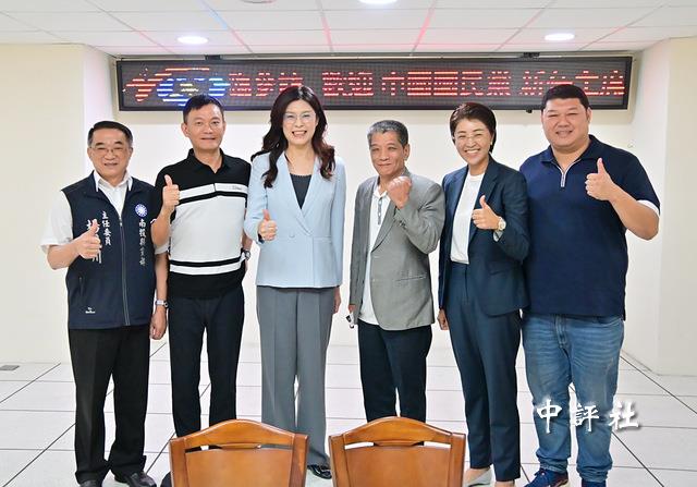 | 左起南投縣黨部主委楊麗川、南投縣副議長潘一全、鄭麗文、議長何勝豐、南投縣長許淑華、藍委游顥。(中評社 方敬為攝) |