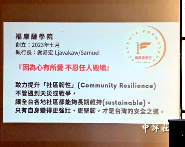 福摩薩學院執行長謝易宏簡報“方舟計畫”。(中評社 方敬為攝)