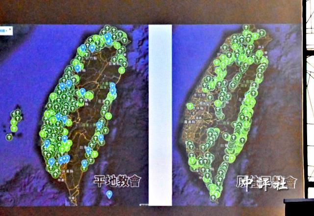 福摩薩學院執行長謝易宏秀出全台長老教會分布地圖。(中評社 方敬為攝)