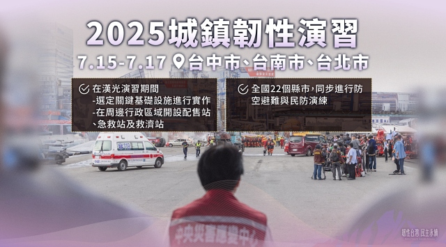 而在舉行實地驗證部分,時序將邁入7月,一年一度的漢光演習即將展開。今年的“漢光41號演習”期間,也將進行“2025城鎮韌性演習”。漢光演習,著重國軍的演訓,而城鎮韌性演習,著重整合非軍事部門對緊急事件的應變,透過軍民協力,展現國家團結的意志,提升台灣的全社會防衛韌性。