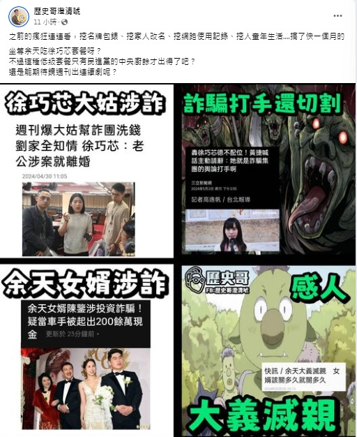 | 歷史哥直酸,藍委徐巧芯因大姑涉詐而被綠營圍攻。現在就看余天會不會被綠營同等檢驗。(歷史哥澄清唬臉書) |