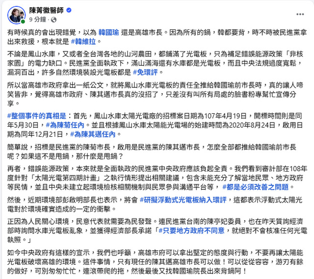 中評社台北10月14日電/中國國民黨籍立委陳菁徽日前揭露,高雄鳳山水庫也鋪設光電板,引發關注;高雄市政府隨即回應,此案是在前市長韓國瑜任內同意籌設。陳菁徽14日在臉書發文反駁,從招標、動工到啟用,三任市長都與此案有關,“不是一句話就能切割乾淨”。