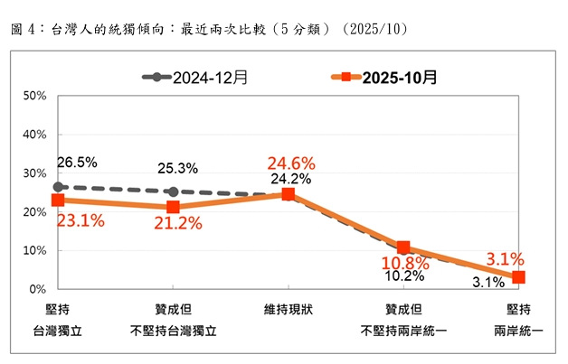 台灣人的統獨傾向—最近兩次比較(五分類)。(圖:台灣民意基金會)