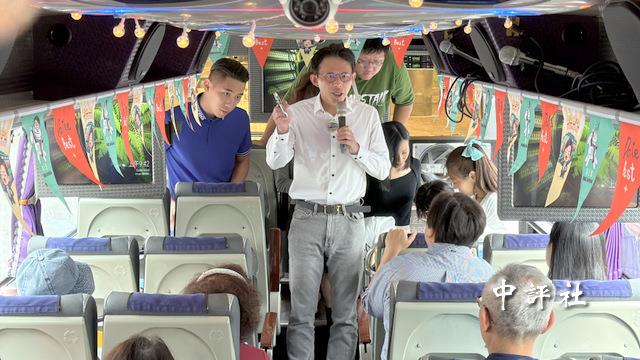 黃國昌在新北歡唱巴士上與長輩互動、高歌。(中評社 鄭羿菲攝)