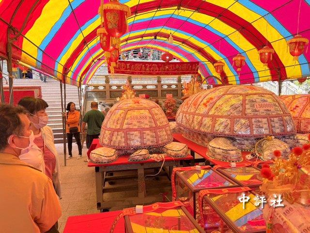 中評社高雄3月2日電(記者 蔣繼平)“乞龜”是元宵節期間常見的民間祈福習俗。位於高雄市三民區的“本館龍池宮”,今年廟埕擺放用紙鈔、錢幣做成的大小錢龜,總價超過新台幣8百萬元造成話題,吸引民眾一探究竟,安全起見廟方也得派人全天守候,成為元宵特殊景象。