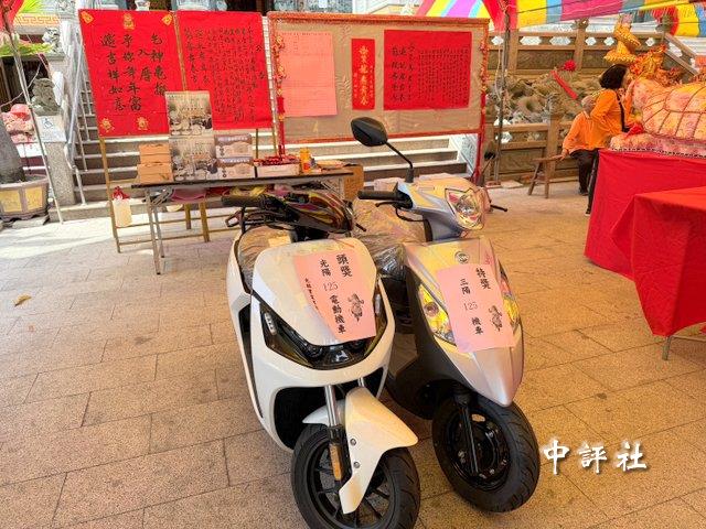 高雄市三民區的“本館龍池宮”元宵節當晚擲筊大賽,大獎兩台機車等待有緣人。(中評社 蔣繼平攝)