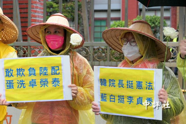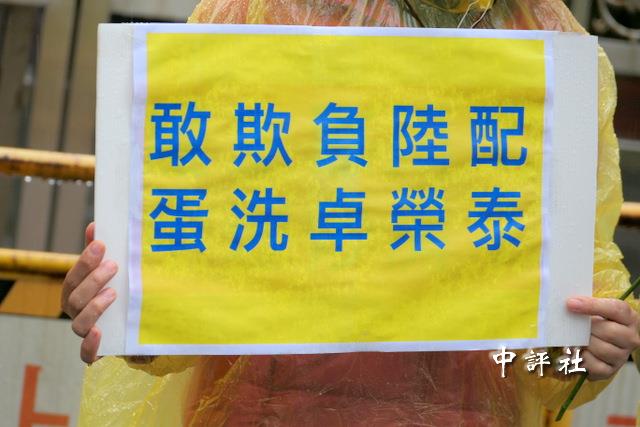 新黨人士手持“敢欺負陸配 蛋洗卓榮泰”的標語。(中評社 張嘉文攝)