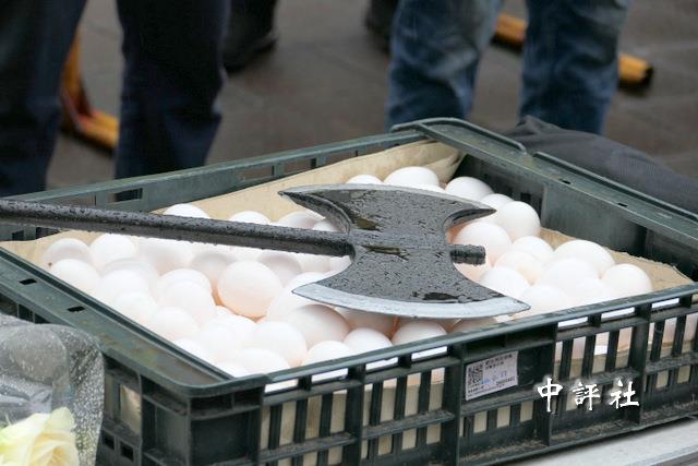 新黨副秘書長游智彬準備了一箱雞蛋。(中評社 張嘉文攝)