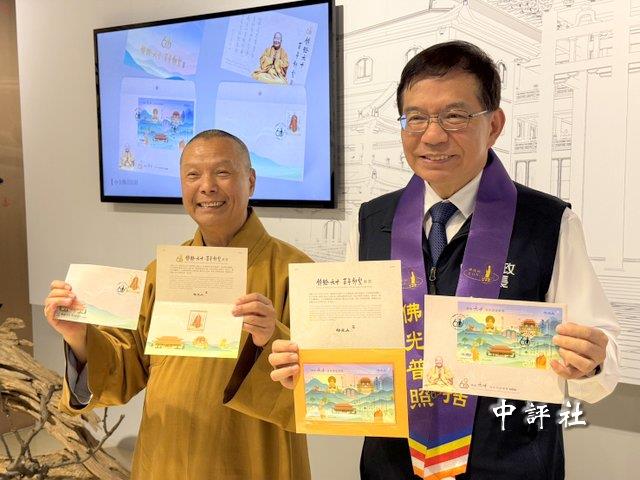 高雄佛光山藏經樓3日舉辦“傳燈六十‧百年仰望郵票”發行典禮,中華郵政董事長王國材、佛光山常務副住持暨都監院院長慧傳法師會後拿郵票受訪。(中評社 蔣繼平攝)